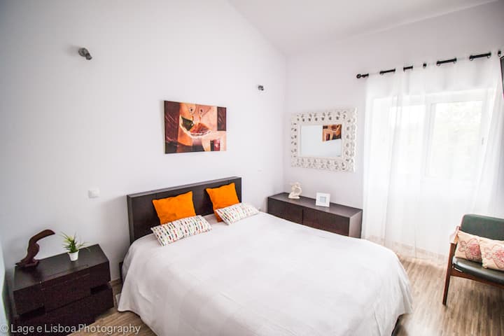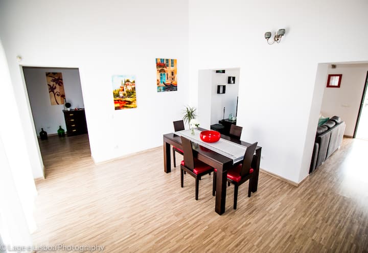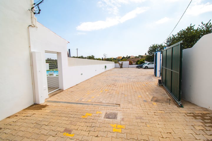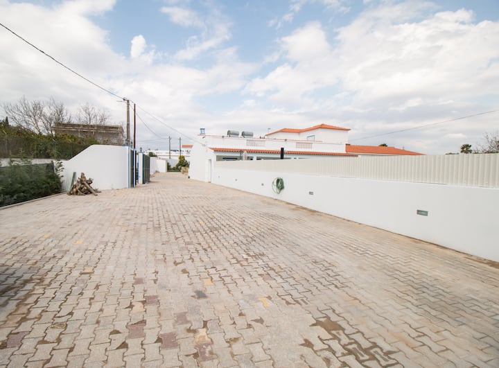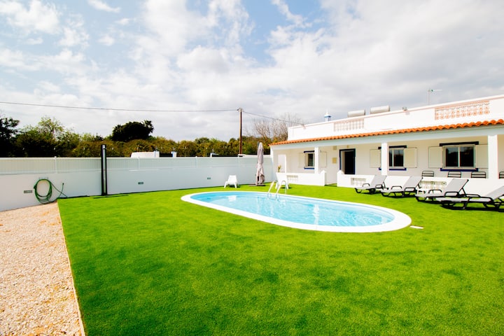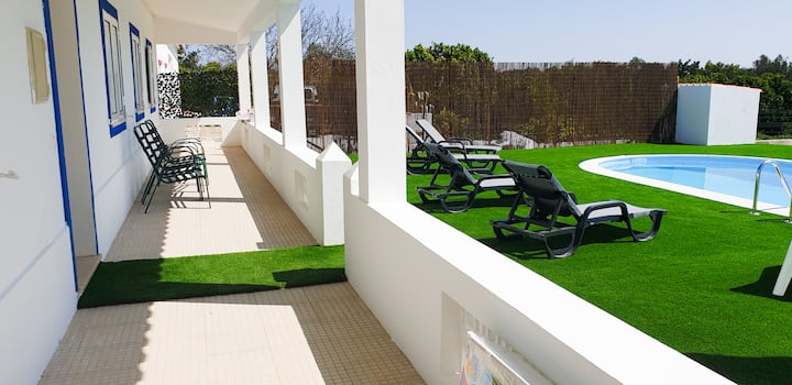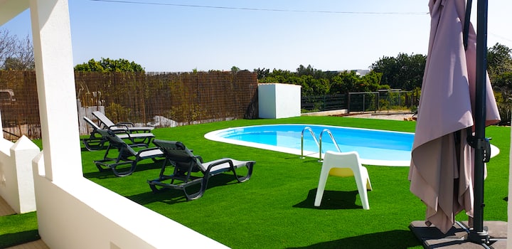 A piscina está o dia inteiro virada a sul, tem uma exposição solar excelente. Pode passar belos dias a descansar com a sua familia/ ou amigos nas espreguiçadeiras, duche solar e o BBQ no terraço. Tudo privado. Na parte de trás tem mesa de refeições, para desfrutar de excelentes refeições.